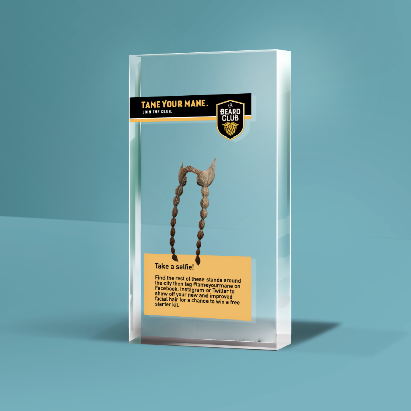 This interactive ad allows passersby to take a photo and share it on their social media. The user simply sets their phone up on the tripod located in front of the ad, lines their face up on the plexiglass, and says “cheese.” They can proceed to share the image on their social media with the hashtag #tameyourmane for a chance to win a free starter kit.