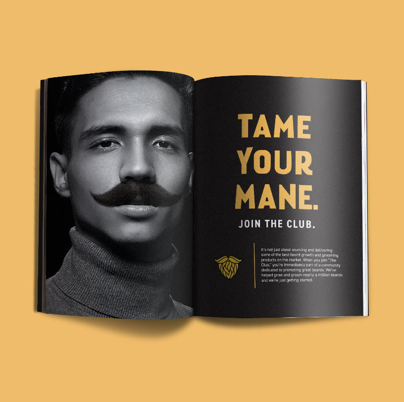 This design study was intended to develop an advertising campaign that generated buyer awareness and boosted sales for the existing company, The Beard Club. The Beard Club’s products solve one of the following two problems for their consumers: lack of facial hair growth, and maintaining unruly facial hair. Two slogans were featured in this campaign including, “Tame Your Mane” and “Skip the Patch.” Tame Your Mane targets the audience that has a plethora of facial hair and is searching for a way to easily maintain and style it. By using the word “mane,” this slogan taps into how wild hair can be if not styled properly. Skip The Patch targets those who are looking to improve and stimulate their facial hair growth.